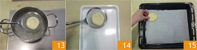 Mit einer Schaumkelle 13 auf ein Tablett abtropfen lassen 14 und anschließend auf ein mit Backpapier ausgelegtes Backblech legen 15.