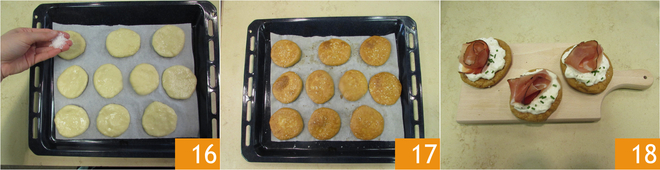 Salzen Sie die Oberfläche mit groben Salzflocken 16 und backen Sie im vorgeheizten Ofen bei 220°C für 20 Minuten. Nach dem Backen herausnehmen 17 und abkühlen lassen. Belegen Sie die Schiacciatine mit Stracciatella, Speck und gehacktem Schnittlauch 18.