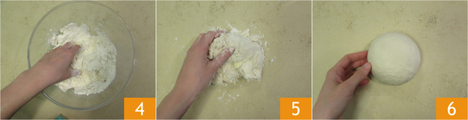 Kneten Sie von Hand 4 und sobald die Flüssigkeiten aufgenommen sind, auf die Arbeitsfläche geben 5 und zu einem glatten Teiglaib formen 6.