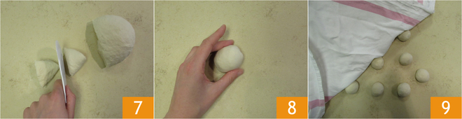 Teilen Sie den Teig mit einem Teigschaber in Stücke von ca. 55 g 7. Formen Sie Kugeln 8 und lassen Sie diese abgedeckt mit einem Tuch ca. 15 Minuten ruhen 9.