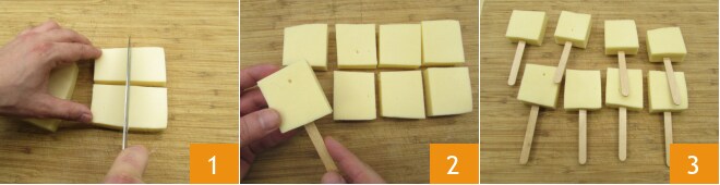 Um den knusprigen Edamer zuzubereiten, schneiden Sie zuerst das Stück Käse so, dass Sie 8 Würfel von 4x4 cm und 2 cm Dicke erhalten 1. Stecken Sie jeden Würfel auf einen Stiel 2, mit den angegebenen Mengen erhalten Sie 8 Stücke 3.