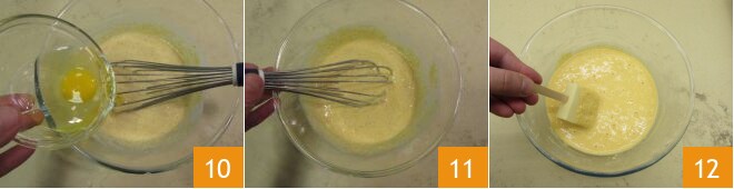 Auch das ganze Ei 10 und das Öl hinzufügen und erneut mischen, um den Teig zu verbinden 11. Auf einem Tablett das grob geriebene Paniermehl verteilen. Alles ist bereit für die Panierung: Tauchen Sie einen Stiel in den Teig 12.