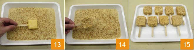 Dann in das Paniermehl 13 tauchen, sodass es vollständig bedeckt ist 14. Nachdem Sie alle Stiele paniert haben, legen Sie sie auf ein Tablett 15.