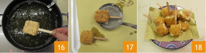 Erhitzen Sie das Pflanzenöl in einem Topf mit hohem Rand und wenn es 150°C erreicht, tauchen Sie einen Stiel nach dem anderen ein 16, frittieren Sie sie für ein paar Minuten, die Zeit reicht aus, um die Panade zu vergolden. Sobald sie gekocht sind, lassen Sie die knusprigen Edamer-Stiele auf einem mit Küchenpapier ausgelegten Tablett abtropfen 17 und servieren Sie sie dann heiß und geschmolzen 18.