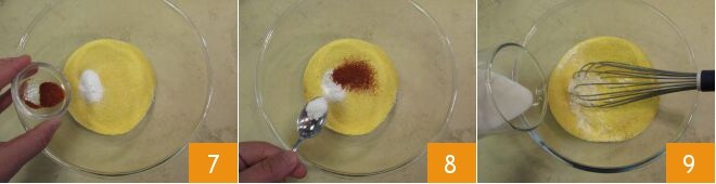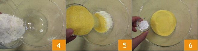 In einer Schüssel das Weizenmehl 4 und das Maismehl 5 vermischen, auch das Natron hinzufügen 6.