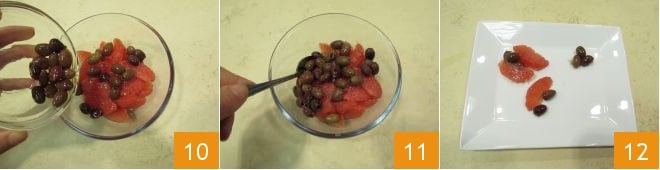Wenn Sie fertig sind, sammeln Sie die Spalten in einer Schüssel, fügen Sie die schwarzen Oliven hinzu 10, würzen Sie mit Salz und Pfeffer und mischen Sie alles 11. Schließlich zur Anordnung übergehen: Auf einem Servierteller etwas Grapefruit- und Taggiasca-Olivensalat anrichten 12