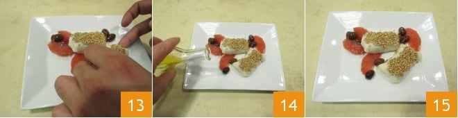 und dann die Filets darauflegen 13. Mit einem Spritzer rohem Öl nach Belieben garnieren 14 und hier ist Ihr knuspriger Seehecht mit Grapefruitsalat: Guten Appetit 15!