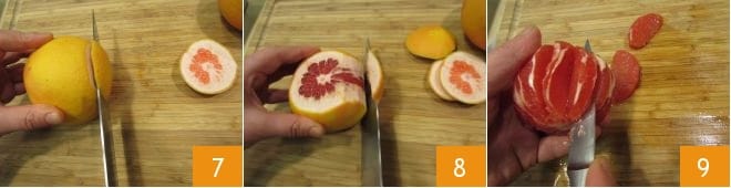 Während die Seehechtfilets im Ofen backen, widmen Sie sich dem Grapefruitsalat. Zuerst müssen Sie die Grapefruit schälen. Schneiden Sie die Kappen ab 7, dann den Rest der Schale, wobei Sie darauf achten, auch den weißen Teil zu entfernen 8. Mit einem scharfen Messer die Fruchtfleischspalten entlang der Häute herauslösen 9