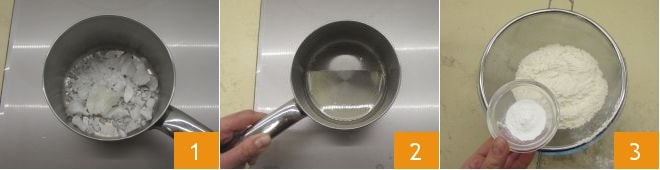 Um die Kokos- und Beerenkringel zuzubereiten, geben Sie zunächst das Kokosöl in einen kleinen Topf 1 und schmelzen es bei schwacher Hitze, bis es flüssig wird 2. Sieben Sie inzwischen das Mehl und das Backpulver in eine separate Schüssel 3.