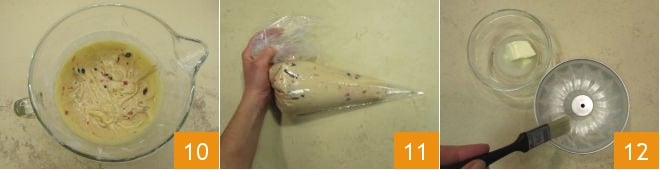 Nachdem Sie die Beeren in den Teig eingearbeitet haben 10, geben Sie ihn in einen Spritzbeutel 11 und fetten 12 und bemehlen Sie 5 Kringelformen mit einem Durchmesser von 12 cm und einer Höhe von 4 cm aus.