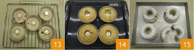 Füllen Sie die Formen bis zur Hälfte ihrer Höhe mit dem Teig 13, backen Sie sie dann im vorgeheizten statischen Ofen bei 180° für etwa 25 Minuten, indem Sie sie auf das mittlere Regal stellen. Sobald sie gebacken sind, nehmen Sie die Kringel aus dem Ofen 14 und lassen Sie sie abkühlen, dann entfernen Sie sie aus der Form. Servieren Sie Ihre köstlichen Kokos- und Beerenkringel bestreut mit reichlich Puderzucker 15!