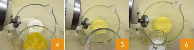Geben Sie nun den Zucker in die Schüssel einer Küchenmaschine mit Flachrührer, fügen Sie die Eier hinzu 4 und arbeiten Sie bei niedriger Geschwindigkeit, bis eine helle und schaumige Masse entsteht. Schalten Sie dann die Küchenmaschine aus, fügen Sie das Kokosöl hinzu 5, arbeiten Sie weiter und fügen Sie nach ein paar Minuten auch die Kokosmilch hinzu 6.