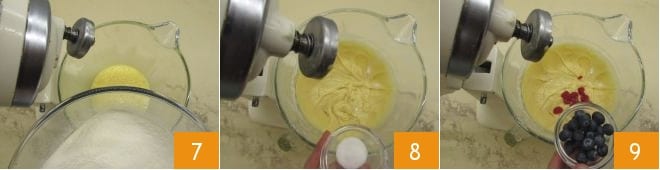 Wenn die Mischung homogen geworden ist, schalten Sie die Maschine erneut aus, geben Sie das zuvor gesiebte Mehl mit dem Backpulver hinzu 7 und arbeiten weiter, bis die Pulver gut vermischt sind. Fügen Sie schließlich das Salz 8, die Himbeeren und die Blaubeeren hinzu 9 und mischen Sie erneut.