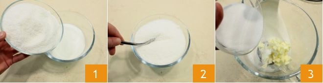 Um den Kokos- und Nutella-Kuchen zuzubereiten, beginnt damit, den Kokos zu rehydrieren, indem ihr ihn in eine kleine Schüssel mit 200 ml Milch gebt 1; rührt um 2 und lasst ihn die Flüssigkeit vollständig aufsaugen. In der Zwischenzeit in die Schüssel einer Küchenmaschine die weiche Butter und den Zucker geben 3 (ihr könnt auch einen elektrischen Handmixer verwenden).