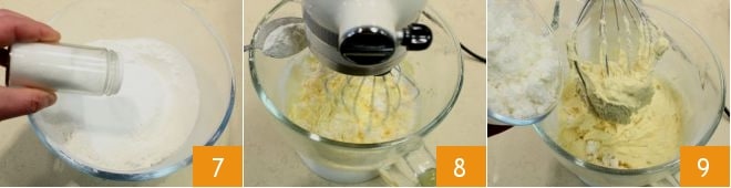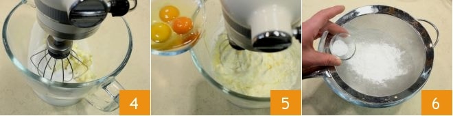 Beginnt damit, die Mischung mit den Rührstäben zu einer homogenen Creme zu verarbeiten 4; dann die Eier einzeln hinzufügen und warten, bis eines eingearbeitet ist, bevor ihr das nächste hinzufügt 5 und lasst die Küchenmaschine weiterlaufen. In der Zwischenzeit das Mehl mit dem Backpulver und dem Natron sieben 6.