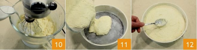 schließlich die restlichen 100 ml Milch hinzugeben 10 und die Mischung weiter verarbeiten, bis eine homogene und dichte Creme entsteht. Eine 24 cm große Backform mit Backpapier auskleiden und den Teig hineingeben 11: Mit einem Löffel glattstreichen 12 und im vorgeheizten statischen Ofen bei 180° für 60 Minuten backen (bei Umluftofen 160° für etwa 50 Minuten). Sollte die Oberfläche zu dunkel werden, kann der Kuchen nach 30 Minuten Backzeit mit Alufolie abgedeckt und weiter gebacken werden.