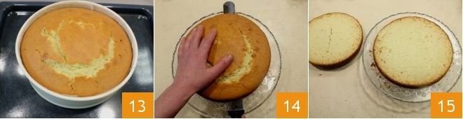 Nach dem Backen den Kuchen aus dem Ofen nehmen 13 und etwas abkühlen lassen. Dann aus der Form nehmen und vollständig auf einem Gitter auskühlen lassen. Sobald er gut abgekühlt ist, kann der Kuchen in der Mitte durchgeschnitten werden (14-15)
