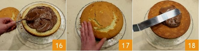 und mit ca. 300 g Nutella gefüllt werden 16. Dann mit der anderen Hälfte des Kuchens abdecken 17 und die restliche Nutella verwenden, um die Außenseite des Kuchens, die Oberfläche 18