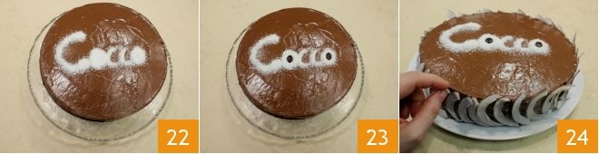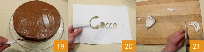 und den gesamten Umfang zu überziehen, indem ihr mit einer Spachtel gleichmäßig verteilt 19. Ein Blatt Papier nehmen, einen Kreis mit demselben Durchmesser wie der Kuchen zeichnen und in der Mitte das Wort "Kokos" ausschneiden 20. Dann frische Kokosscheiben fein schneiden 21.