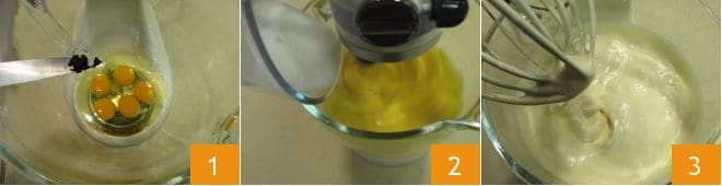 Um den Kokos-Zitronen-Kuchen zuzubereiten, beginnen Sie mit dem Biskuit. Geben Sie die Eier in die Schüssel einer Küchenmaschine, fügen Sie die Samen der Vanilleschote 1 und eine Prise Salz hinzu und beginnen Sie, sie mit dem Schneebesen bei mittlerer Geschwindigkeit zu schlagen. Währenddessen fügen Sie langsam den Zucker hinzu 2 und schlagen die Eier etwa 15 Minuten lang, bis sie voluminös und schaumig sind.