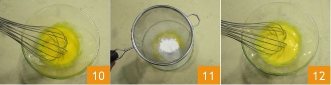 und rühren Sie schnell mit einem Schneebesen 10. Sieben Sie die Stärke direkt in die Schüssel 11 und rühren Sie erneut, um die Zutaten zu vermengen 12.