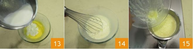 Sobald die Milch heiß ist, gießen Sie sie in die Eigelbmischung 13 und schlagen Sie schnell mit dem Schneebesen 14. Gießen Sie alles zurück in den Topf 15.