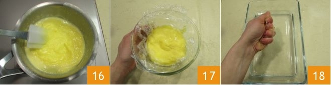 und rühren Sie ständig, bis die Creme eingedickt ist 16. Geben Sie sie in eine kleine Schüssel und decken Sie sie mit Frischhaltefolie ab 17. In der Zwischenzeit weichen Sie das Gelatineblatt in kaltem Wasser ein und drücken es aus, sobald es weich ist 18.