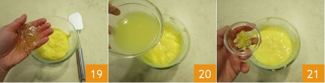 und fügen Sie es der Creme hinzu 19, die nicht kochend, aber dennoch warm sein sollte. Fügen Sie dann den Saft 20 und die abgeriebene Zitronenschale hinzu 21.