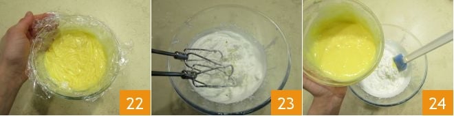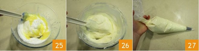 und mischen Sie mit einem Spatel von unten nach oben 25, um die Masse nicht zu entleeren. Sobald Sie eine schaumige Creme erhalten haben 26, geben Sie sie in einen Spritzbeutel 27 und bewahren Sie sie im Kühlschrank auf.