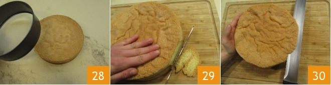 In der Zwischenzeit ist auch der Biskuit abgekühlt; lösen Sie ihn aus der Form 28 und entfernen Sie die äußere Kruste, sowohl um den Umfang 29 als auch auf der Oberfläche 30.