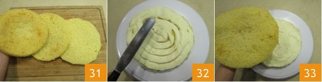 Schneiden Sie mit einem langen gezackten Messer den Biskuit in 3 Scheiben mit der gleichen Dicke 31. Platzieren Sie die erste auf einem Servierteller und geben Sie etwa 1/3 der Creme darauf, indem Sie sie gleichmäßig verteilen 32. Decken Sie mit der zweiten Biskuitschicht ab 33.