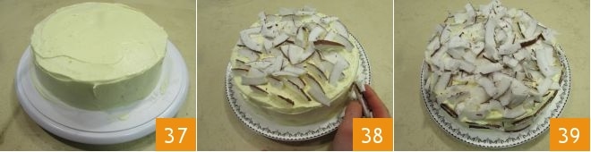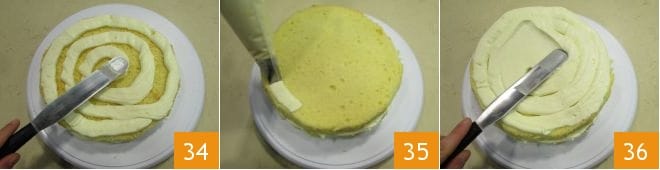 und fügen Sie eine weitere Schicht Creme hinzu 34. Platzieren Sie die letzte Scheibe und verteilen Sie die restliche Creme sowohl auf der Oberfläche als auch an den Seiten 35 und glätten Sie die Creme mit einem Spatel 36.