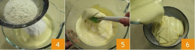 Schalten Sie dann die Maschine aus und sieben Sie das Mehl und die Speisestärke direkt in die Schüssel 4. Dann mischen Sie vorsichtig mit rotierenden Bewegungen von unten nach oben 5. Sobald Sie eine einheitliche Masse erhalten haben, geben Sie sie in eine zuvor gebutterte und bemehlte 24 cm Form 6.