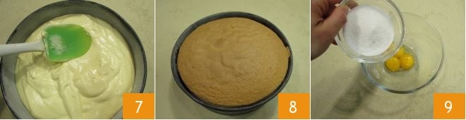 Glatten Sie die Oberfläche vorsichtig ab 7, ohne die Form auf die Arbeitsfläche zu schlagen, und backen Sie sie im vorgeheizten statischen Ofen bei 160° im untersten Fach etwa 50 Minuten. Vermeiden Sie es, den Ofen während dieser Zeit zu öffnen, und überprüfen Sie die Garzeit immer mit der Stäbchenprobe, da jeder Ofen unterschiedlich backt. Sobald das Stäbchen in der Mitte des Kuchens eingeführt wird, sollte es komplett trocken herauskommen. Sobald er gebacken ist, nehmen Sie den Biskuit aus dem Ofen und lassen ihn abkühlen 8. In der Zwischenzeit bereiten Sie die Creme vor. Erhitzen Sie zuerst die Milch in einem Topf, bis sie fast kocht. Geben Sie die Eigelbe in eine Schüssel und fügen Sie den Zucker hinzu 9.