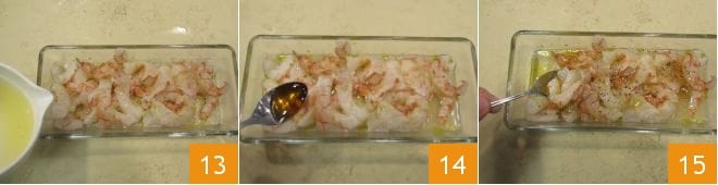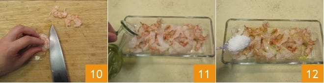 In der Zwischenzeit schneiden Sie die Garnelen der Länge nach in zwei Hälften 10; sollten Ihre Garnelen noch nicht gereinigt sein, können Sie unserer Kochschule folgen: Wie man Garnelen reinigt. Legen Sie sie nach und nach in eine Schüssel und würzen Sie sie mit dem Öl 11 und den Salzflocken 12.