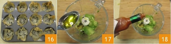 Zu diesem Zeitpunkt sind die Filoteigkörbchen fertig gebacken und Sie können sie aus dem Ofen nehmen 16. Lassen Sie sie abkühlen und bereiten Sie in der Zwischenzeit die Guacamole-Sauce vor. Schneiden Sie die Avocado in zwei Hälften, entfernen Sie den Kern und geben Sie das Fruchtfleisch in einen Mixer, indem Sie es mit einem Löffel herauslösen. Fügen Sie dann das Öl 22, einige Tropfen Tabasco 23 und eine Prise Salz hinzu.