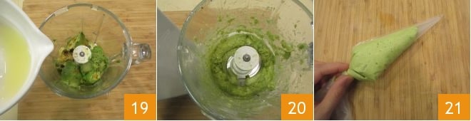 und den Limettensaft 19. Mixen Sie alles zu einer Creme 20 und geben Sie die Sauce in einen Spritzbeutel 21.