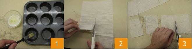 Um die Körbchen mit Garnelen und Avocado zuzubereiten, schmelzen Sie zuerst die Butter und lassen Sie sie abkühlen. Verwenden Sie sie, um eine 12er-Muffinform zu fetten, und nehmen Sie eines der Filoteigblätter, indem Sie den Teig vorsichtig abblättern und die anderen Blätter unter einem Tuch aufbewahren, damit sie nicht austrocknen. Schneiden Sie das Filoteigblatt in der Länge in zwei Hälften 2 und schneiden Sie aus jeder Hälfte 4 Rechtecke 3.