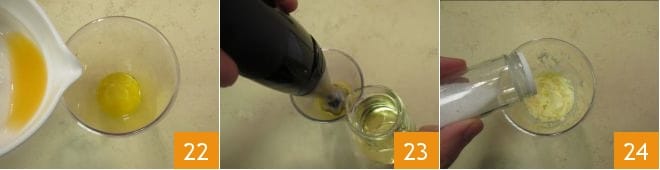 In der Zwischenzeit bereiten Sie die Zitrusmayonnaise vor. Geben Sie in den Behälter eines Mixers die 2 Eigelbe, den Saft einer Mandarine 22 und emulgieren Sie das Ganze mit einem Stabmixer, während Sie das Öl langsam zugeben 23. Sobald Sie eine Konsistenz ähnlich der von Mayonnaise erreicht haben, stoppen Sie, fügen Sie das Salz 24 und den Pfeffer hinzu.