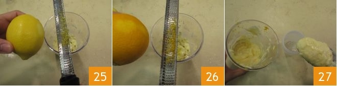 Fügen Sie dann die Zitronenschale 25 und die Orangenschale 26 hinzu. Mischen Sie alles und geben Sie es in eine Küchenflasche 27.