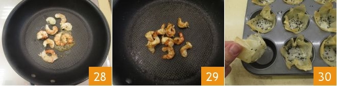 Zu diesem Zeitpunkt die Garnelen von der Marinade abtropfen lassen und in eine sehr heiße Pfanne geben 28. Braten Sie sie für nur wenige Minuten, bis sie gut gebräunt sind 29, und stellen Sie sie dann beiseite. Formen Sie die Körbchen vorsichtig aus 30 und legen Sie sie auf eine Platte.