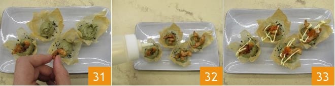 Jetzt füllen Sie sie, indem Sie sie mit etwas Avocadocreme, zwei Garnelenstücken 31 füllen und mit etwas Zitrusmayonnaise 32 bedecken. Garnieren Sie mit einigen Lachseiern und servieren Sie die Körbchen mit Garnelen und Avocado 33.