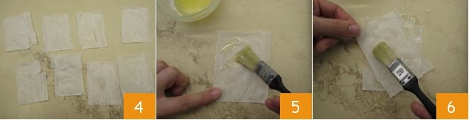 Auf diese Weise erhalten Sie 8 gleiche Rechtecke 4; für jedes Körbchen müssen Sie 2 Rechtecke verwenden. Dann bestreichen Sie die gesamte Oberfläche eines der Rechtecke mit der geschmolzenen Butter 5 und legen Sie ein weiteres Rechteck darauf, sodass die Seiten nicht übereinstimmen, sondern die Spitzen leicht versetzt sind, um eine Art Stern zu bilden. Bestreuen Sie erneut mit der Butter 6.