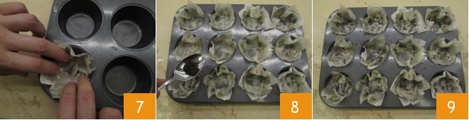 und legen Sie beide Blätter in die Form. Drücken Sie leicht mit den Fingern, damit es gut haftet und eine Art Körbchen bildet 7. Fahren Sie auf diese Weise fort, bis alle Teile aufgebraucht sind, schneiden Sie dann ein weiteres Blatt und so weiter, bis alle Mulden der Form gefüllt sind und Ihre 12 Körbchen erhalten sind. Bestreuen Sie sie mit den schwarzen Sesamsamen (8-9) und backen Sie die Körbchen im vorgeheizten Umluftofen bei 190°C für 7-8 Minuten auf der mittleren Schiene.