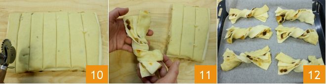 Jetzt, wo Sie fertig sind, übertragen Sie den Kranzteig auf ein Tablett, um ihn so zu schneiden, dass, falls die Füllung austreten sollte, Sie sie zurückholen können. Mit einem Teigschneider schneiden Sie Streifen von 3x13 cm 10 und wickeln Sie sie auf sich selbst 11, um eine Spirale zu bilden. Legen Sie die so erhaltenen Kränze auf ein mit Backpapier ausgelegtes Backblech 12, bestreichen Sie sie mit 1 geschlagenen Ei und lassen Sie sie etwa 2 Stunden lang gehen, damit sie ihr Volumen verdoppeln. Dann backen Sie die Kränze in einem vorgeheizten statischen Ofen bei 180° für 25 Minuten (wenn Sie einen Umluftofen verwenden, bei 160° für 15-20 Minuten).