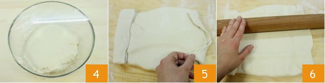 Dann fahren Sie mit den Falten fort: Falten Sie die beiden kürzeren Seiten so, dass sie in der Mitte der längeren Seite zusammenfallen 7: Stellen Sie sicher, dass sich die beiden Kanten nicht überlappen und falten Sie es zu einem Buch 8. Wenn Ihr Stück fertig ist, markieren Sie es mit einem Druck des Fingers (was Sie daran erinnert, dass Sie gerade die erste Falte gemacht haben), wickeln Sie den Teig in Frischhaltefolie 9 und legen Sie ihn für mindestens eine halbe Stunde in den Kühlschrank. Fahren Sie auf diese Weise mindestens dreimal fort, wobei Sie immer mit den Fingern die durchgeführte Falte markieren. Beim letzten Falten legen Sie den Blätterteig für eine Stunde in den Kühlschrank.