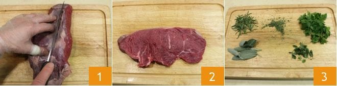 Um das Steak mit aromatischen Kräutern zuzubereiten, schneiden Sie das Rumpsteak in eine 500 g schwere Scheibe von 3-4 cm Dicke (1-2). In der Zwischenzeit bereiten Sie die Kräutermischung vor, die zum Würzen des Steaks benötigt wird: Entfernen Sie den holzigen Teil des Rosmarins, so dass nur die Nadeln übrig bleiben, und legen Sie sie auf ein Schneidebrett, fügen Sie die Salbeiblätter, Majoran, Thymian und Petersilie hinzu 3, hacken Sie die Kräuter fein mit einem Messer.