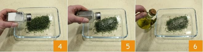 Geben Sie die erhaltene Mischung in eine Schüssel, würzen Sie mit Salz 4, gemahlenem schwarzen Pfeffer 5 und Olivenöl 6, mischen Sie die erhaltene Emulsion und verwenden Sie sie