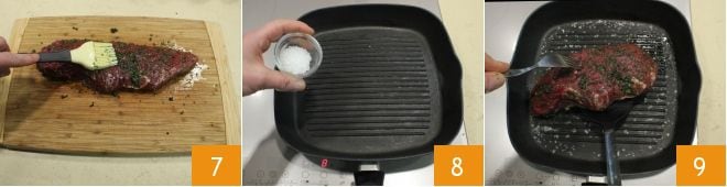 um das Fleischstück auf beiden Seiten zu bestreichen 7. Fahren Sie mit dem Kochen des Steaks fort: Stellen Sie eine Grillplatte auf den Herd, streuen Sie grobes Salz über die Oberfläche 8. Wenn die Platte heiß ist, legen Sie das Fleischstück darauf: Um eine perfekte Garstufe zu erreichen, braten Sie es auf beiden Seiten jeweils 3-4 Minuten an, indem Sie es mit einem Spatel wenden 9. Durch das kurze Braten bleibt das Steak innen rosa und behält alle seine Säfte, es wird empfohlen, die Garzeit nicht zu verlängern, da das Fleisch sonst innen zu trocken wird.