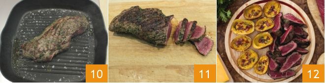 Nach dem Kochen 10 legen Sie das noch heiße Fleisch auf ein Schneidebrett und schneiden Sie es in etwa 1 cm dicke Scheiben 11. Servieren Sie das aromatische Kräutersteak sofort heiß und begleiten Sie es mit köstlichen Beilagen wie den gefüllten Kartoffelbooten 12 oder wenn Sie eine leichtere Beilage wünschen, servieren Sie es mit einem gemischten Salat.